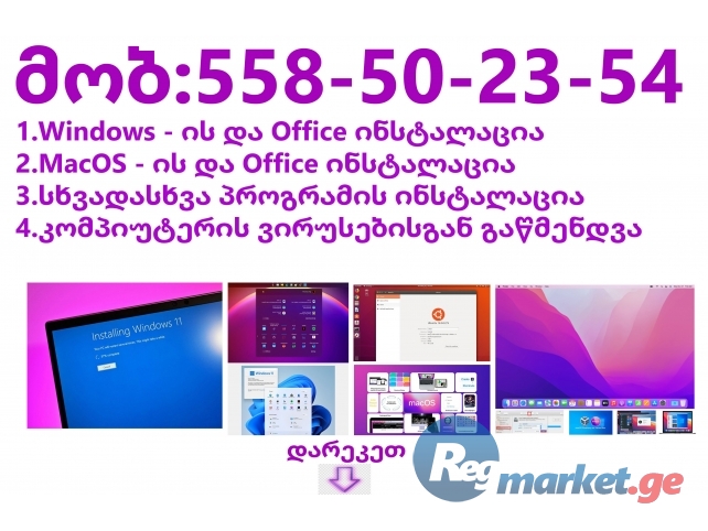 კომპიუტერული მომსახურება ადგილზე გამოძახებით და დისტანციურად მოგემსახურებათ გამოცდილი პროფესიონალი ამ სფეროში Windows, Linux, MacOS და სხვადასხვა სისტემების ინსტალაცია სწრაფად და ხარისხიანად თავისი სტანდარტული პროგრამებით და ანტი ვირუსით, ასევე კომპიუტერის ტექნიკურ გაუმართაობას ჩავუტარებ დიაგნოსტიკას და შევაკეთებ ადგილზევე. მობ:595314841 მობ:558502354