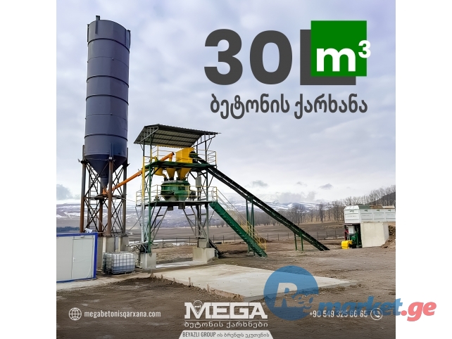 MEGA 30 მ³ / საათი - ბეტონის ქარხანა, დანადგარი განკუთვნილია სრულად ავტომატიური ოპერაციული სისტემით და 24 საათიანი მუშაობისათვის. ცემენტი,წყალი,სილა,ხრეში,დამსხრეული ქვა და აგრეკატის ნაირი მზა ბეტონი კომპონენტებით შეგროვების მაშტაბით აწონის და მიქსერში გამორევით, მზა ბეტონი წარმოების განხორციელება და გადამზიდი მიქსერში გადაცემის სისტემაა.