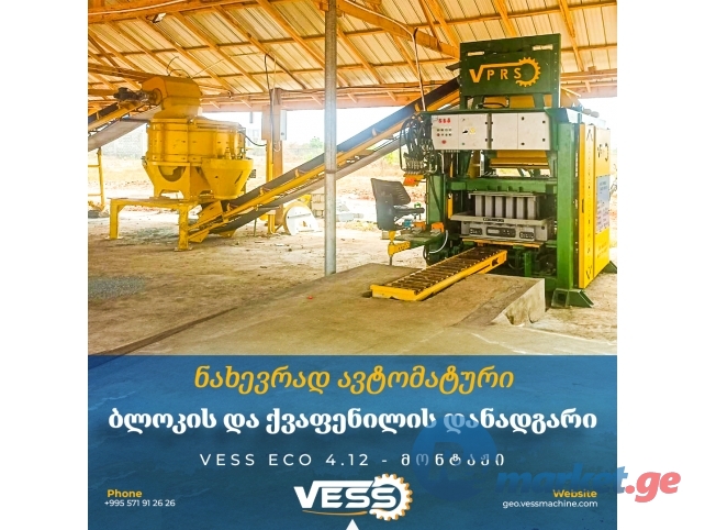 იყიდება VESS მარკის ECO 4.12 ნახევრად ავტომატური ქვაფენილის და ბლოკის დანადგარი. ნახევრად ავტომატური ოპერაციული სისტემით, ბეტონის მორევის სამუშაოები სრულდება მიწის ზედაპირზე. გათვლილია 24 საათიანი მუშაობისთვის. ასევე გვაქვს სხვადასხვა ავტომატიზაციის სისტემები და მოცულობების წარმოება. გაქვთ საშუალება მხოლოდ ყალიბის შეცვლის შემთხვევაში, აწარმოოთ: 5 სმ.-დან / 25 სმ-მდე სიმაღლის მასალა, ეს იქნება: ქვაფენილი, ბლოკი, იზობლოკი, ბორდიურები , სართულშუა გადახურვის ფილა, ბუხარის ქვა თუ ბეტონი. დღიური წარმოება (8 საათში) 4.000 ბლოკი ხოლო 300 მ² ქვაფენილი და 1.000 ცალი ბორდიური. ბუნკერის რაოდენობა / ერთ ბუნკერიანი, მართვის სისტემა ოპერატორის კონტროლით.