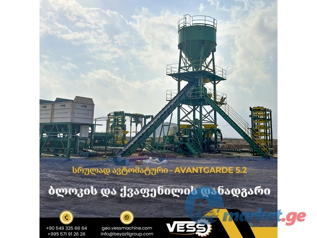 იყიდება COMPACT / AVANTGARDE 5.2 სრულად ავტომატური სისტემის ბლოკის-ქვაფენილის-ბორდიურის და ბეტონის ქარხანა. ორ ბუნკერიანი - სრულად ავტომატური სისტემა. უმაღლესი ხარისხის PAN მიქსერი / მოცულობა 0.50 მ³. SCADA კომპიუტერული პროგრამა ელექტრო გაყვანილობა გერმანული ორიგინალი SIEMENS - SCHNAIDER. ბლოკის ქარხნის დისტანციური მართვის შესაძლებლობა. კომპიუტერული პროგრამის დამცავი ონლაინ UPS – PLC.