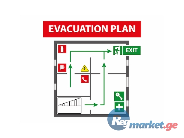 ევაკუაციის მარშრუტების, სახანძრო ინვენტარისა და გამოსასვლელების დატანას;