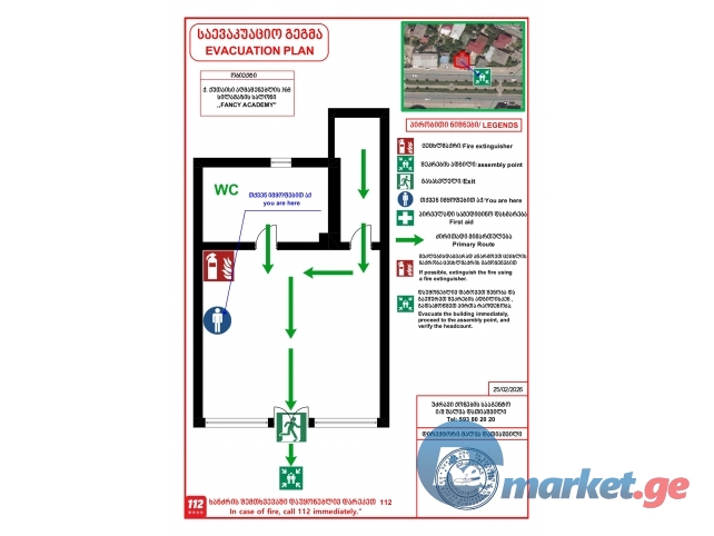 ევაკუაციის მარშრუტების, სახანძრო ინვენტარისა და გამოსასვლელების დატანას;