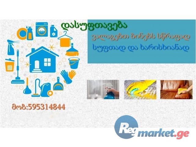 ვალაგებთ ბინებს სწრაფად და ხარისხიანად წლების გამოცდილებით გამოცდილებით სტანდარტული და გენერალური დალაგების ფასი განისაზღრება დალაგების კატეგორიის და სირთულის მიხედვით . მობ:595314844 მობ:579376108